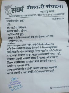 चिंचोली मोराची येथील उकिरडेमळा भागातील सुमारे वीस ते पंचवीस शेतकरी गेल्या चार-पाच वर्षांपासून शेतीच्या रस्त्याच्या समस्येने त्रस्त आहेत. शिरूर तहसीलदार कार्यालयात वारंवार चकरा मारूनही आणि निकाल लागूनही रस्ता मोकळा होत नसल्याने शेतकरी हतबल झाले आहेत. या प्रश्नावर प्रशासनाकडून “तारीख पे तारीख” मिळत असल्याने आता संघर्ष शेतकरी संघटना आणि नवज्योत ग्रामविकास फाउंडेशनच्या माध्यमातून ९ ऑक्टोबर रोजी शिरूर तहसीलदार कार्यालयासमोर ‘घंटानाद’ आंदोलन करण्याचा इशारा देण्यात आला आहे.पोलिस प्रशासनाला निवेदन देताना संघर्ष शेतकरी संघटनेचे पदधिकारी व कार्यकर्ते